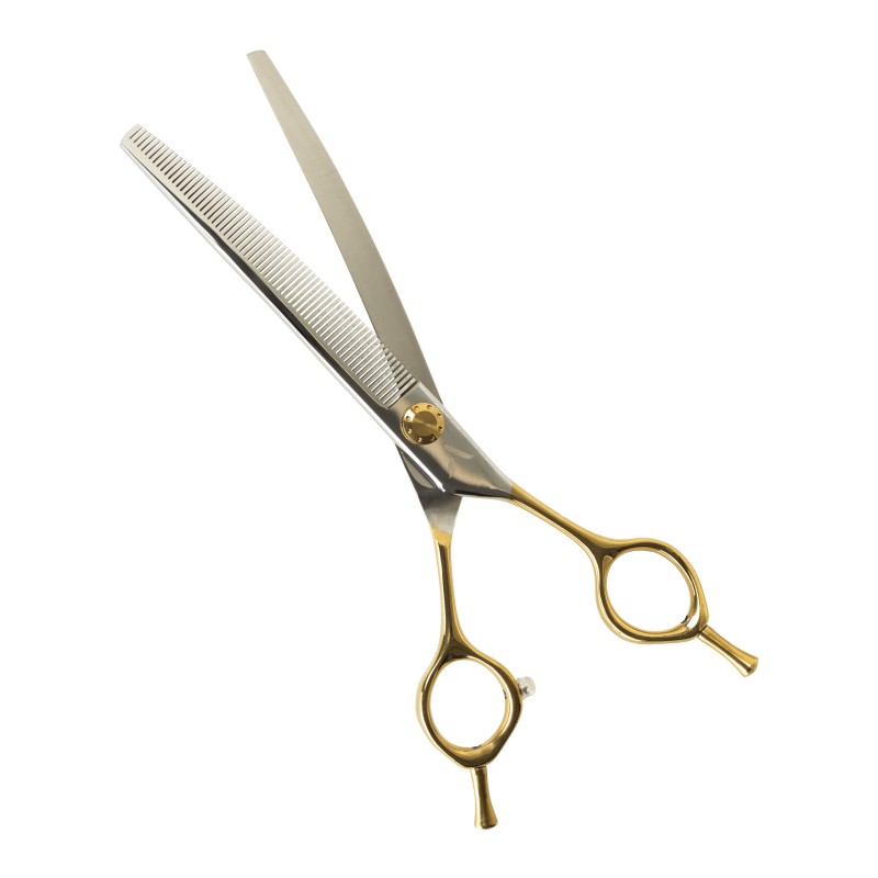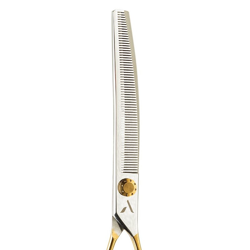 The 64 teeth create a velvety effect on curly hair and leave no cutting marks on straight hair. It is recommended to use them only on clean, tangle-free hair, avoiding very thick coats. Some of the breeds recommended for using AKENA scissors are: Maltese, Yorkie, Shih Tzu, Spaniels, Schnauzer, Terriers, Golden Retriever, Newfoundland, Poodle, and Lagotto. These scissors are essential for daily trimming; the wider teeth are ideal for creating a line. The design of the teeth and the cutting technology of the blades offer a comfortable feel in the hand, despite the symmetrical shape of the handles; The double finger rest makes the scissors suitable for straight and reverse cutting.